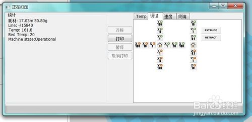 接下来我们就可以将其与3D打印机连接起来,进行操作打印了。操作步骤如下图所示:(需要设置好必备的“喷头温度”、“平台温度”等选项)。