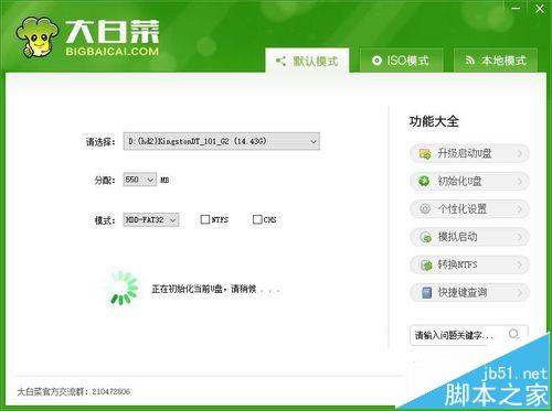 把准备好的U盘插入电脑,左键双击系统桌面上的【大白菜UEFI版】图标,在打开的大白菜窗口的【默认模式】下点击:一键制作启动U盘;