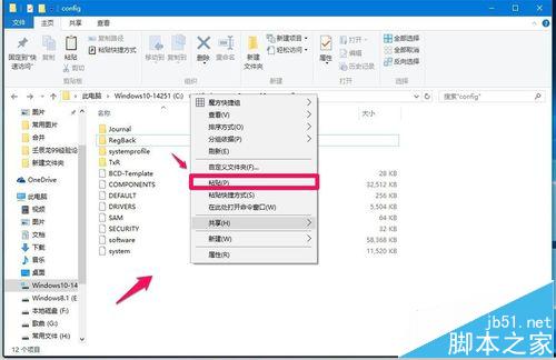 9、退回到config文件夹窗口,右键点击空白处,在右键菜单中点击:粘贴(如果出现提示是否覆盖原有的SYSTEM,选择“是“。);