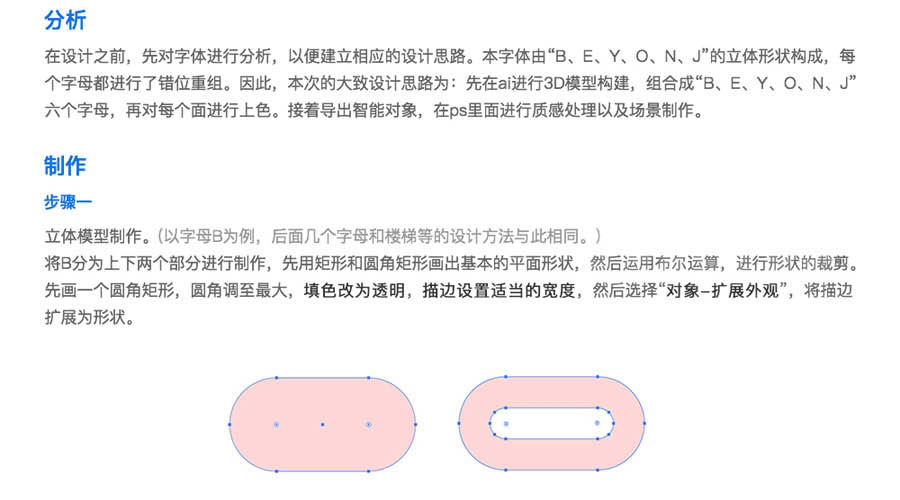将B分为上下两个部分进行制作,先用矩形和圆角矩形画出基本的平面形状,然后运用布尔运算,进行形状的裁剪。先画一个圆角矩形,圆角调至最大,填色改为透明,描边设置适当的宽度,然后选择"对象-扩展外观",将描边扩展为形状。