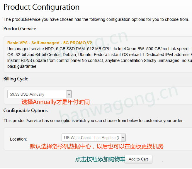 我们然后会看到上图所示的界面,根据图示我们需要确定选择的方案以及时间,默认是洛杉矶机房,我们也可以选择其他的几个机房之一,点击"ADD TO CART"添加购物车。
