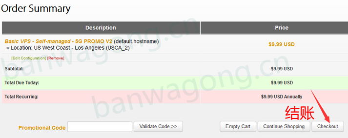 核对我们选择方案的价格,没有问题后点击CHECKOUT结账。