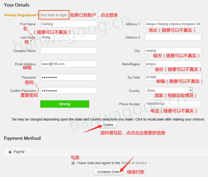 根据上图,如果我们有过账户,可以直接点击"Click here to login"登录以及付款就可以,如果还没有账户则需要注册账户。个人信息不要真实的,但也不能太离谱和乱写字符出来,好歹也要稍微用点拼音。
