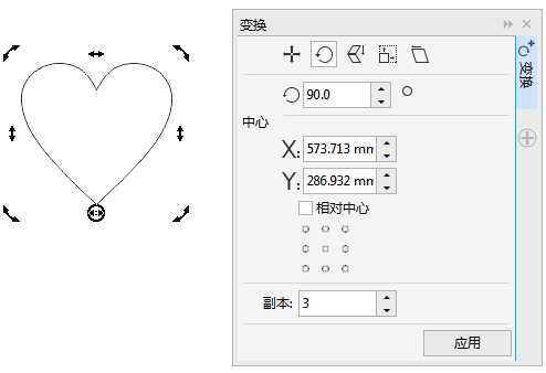 4. 选中心形,再次单击,呈可旋转状态,将旋转中心点垂直向下移动,执行“窗口>泊坞窗>变换”,在右侧弹出的面板中选择“旋转”命令并设置旋转选项,如图所示。