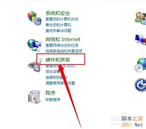 3、点击控制面板之后会弹出控制面板的主界面,在这个主界面上找到“硬件和声音”找到之后点击硬件和声音。