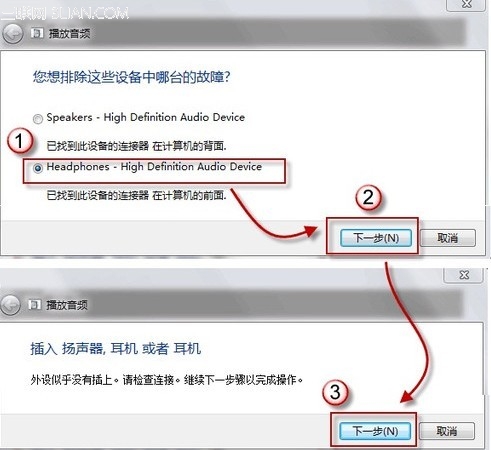 3、在故障对话框中,选择 Headphones,并点击下一步;此时,它会给出诊断信息:外设没有插上;并给出修复建议:插上扬声器或耳机。