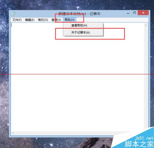 2、打开记事本程序以后,点击记事本程序菜单界面中的“帮助”选项,然后点击选择“关于记事本”菜单按钮。