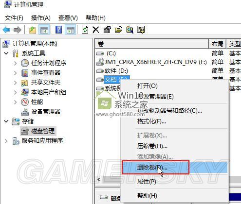 2、打开计算机管理界面后,点击存储的“磁盘管理”,然后在右侧窗口找到无法格式化的磁盘,点击右键,选择“删除卷”,如下图所示: