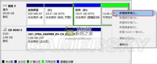 4、删除后我们可以看到原来的磁盘变成了绿色的磁盘,我们点击鼠标右键选择“新建简单卷”,如下图所示: