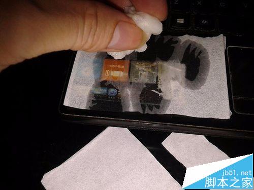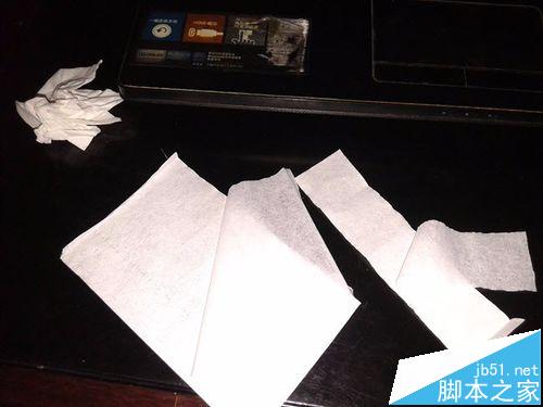 5、轻轻把纸团里的水挤在辅好的纸巾上,注意不要挤太多水,以免纸巾含不住水份流到键盘或插孔里就糟了,打湿即可;
