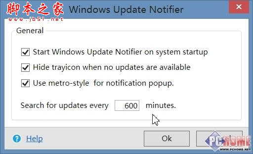 由于WUN是个绿色工具,所以每次重启后都需要重新运行它,勾选第一个选项可以将它设为随系统启动。第二个选项则是让WUN在没有搜索到更新的时候隐藏任务栏图标,第三个选项为是否采用Windows8风格的气泡通知。最后一个数值框则是每次搜索更新的间隔时间,单位为分钟,默认每小时搜索一次。小编觉得这个频率可以降低些,大家根据自己每天使用电脑的时间来决定,保证每天开机后检查一次就够了。