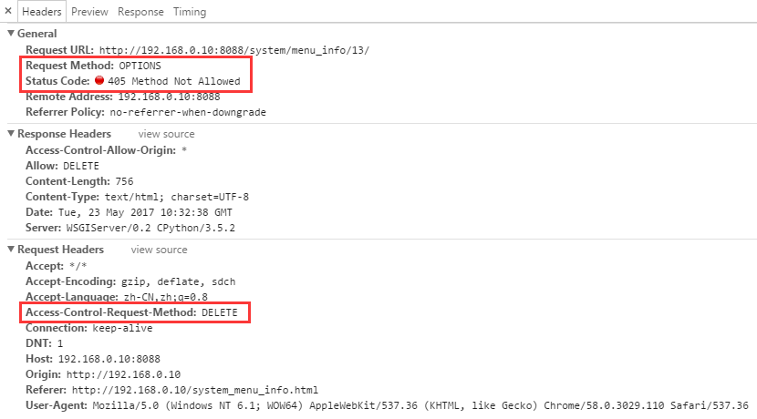 这两天在用python的bottle框架开发后台管理系统,接口约定使用RESTful风格请求,前端使用jquery ajax与接口进行交互,使用POST与GET请求时都正常,而Request Method使用PUT或DELETE请求时,直接爆“HTTP Error 405: Method Not Allowed”错误。而ajax提交的Request Method值DELETE也变成了OPTIONS了。