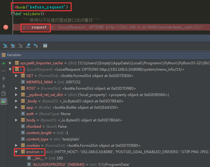 说干就干,在主文件main.py中,添加了bottle勾子 @hook('before_request') 函数(引用:from bottle import request),然后添加r = request,用来接收bottle的request变量,方便debug时在IDE的Debugger视图中查看request里面的值,见下图