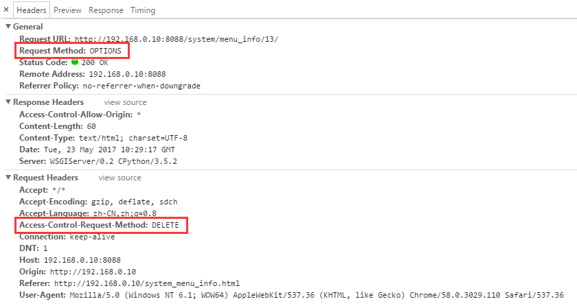 重新启动python服务后,我们再次提交一下ajax,就可以发现提交成功了,检查http请求头,Request Method的值还是OPTIONS,但服务器已经可以正常接收请求了