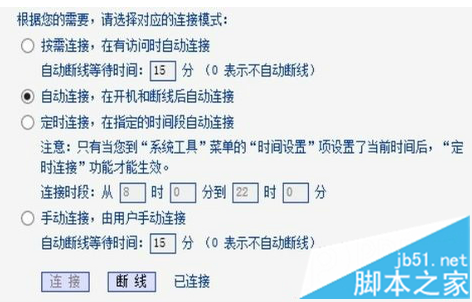 4、在下方可以看到“根据您的需要,请选择对应的连接模式”,然后选择“自动连接,在开机和断线后自动连接”选项,然后点击下方的“保存”按钮;