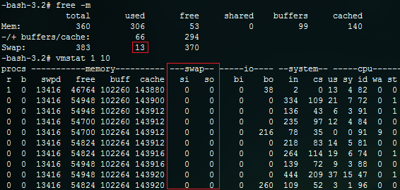 如下图,系统虽然占用了13M的swap,但是没有进行swap交换。