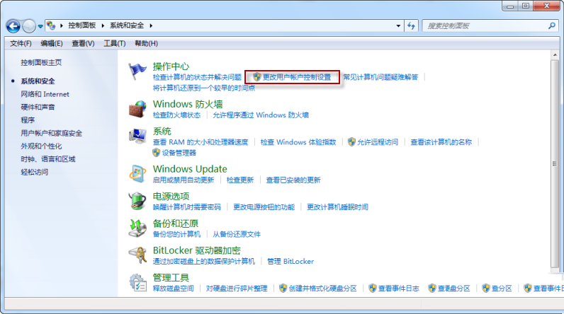 开始——控制面板——系统和安全——操作中心,点击【更改用户账户控制设置】;