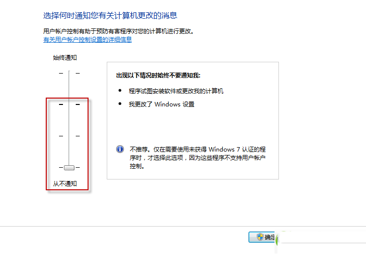 将控制调到【从不通知】。(粗横线以下的3中选择都是“从不通知”,可根据你的实际需求选择不同程度的控制)