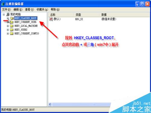 进入注册表后,选择HKEY_CLASSES_ROOT,点其旁边的+或三角可展开注册表
