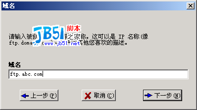如果你自己有服务器,有固定的IP,那就请输入IP地址,如果你只是在自己电脑上建立FTP,而且又是拨号用户,有的只是动态IP,没有固定IP,那这一步就省了,什么也不要填,Serv-U 会自动确定你的IP地址,“下一步”;