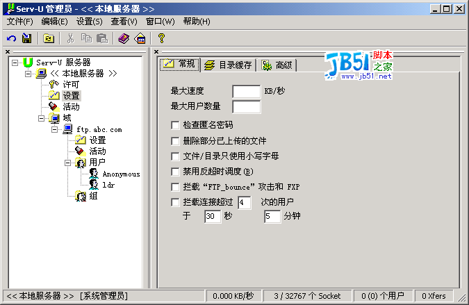 可以限制服务器的最大速度,可以拦截FXP(站点到站点传送),也可以限制用户的数量,这样不至于你的服务器被拖跨。“目录缓存”设置中,如图