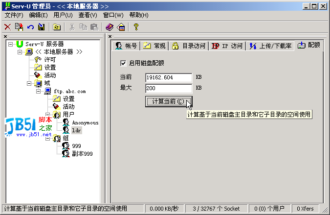 这里你可以为每个FTP用户设置磁盘空间,点击“计算当前”,可以知道当前目前下的所有空间大小,在“最大”一栏中填入你想要限制的容量。