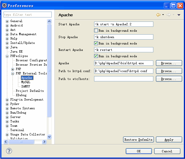 2、由于我自己根据phpstudy2011B封装的PHP集成环境,apache的服务名称为apache2,但是Eclipse默认启动的是apache2.2,所以我将注册apache服务的名称改为apache2.2后正常。