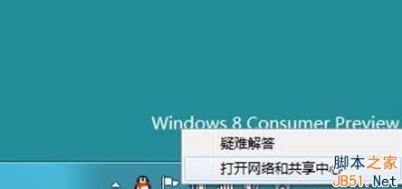 1、首先切换到Win8传统的桌面界面,然后在右下角任务栏上,找到网络图标,然后把鼠标放右键任务栏网络图标上,单击鼠标右键,之后即可选择打开“网络和共享中心”了,如下图: