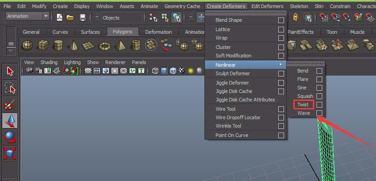 7、在创建变形菜单下拉菜单里找到非线性选项,在非线性子级菜单里找到Twist选项,如图所示: