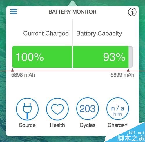 5、当前个人所使用的 Mac 笔记本电脑是从2013年末购买的,一直到现在差不多有一年半了,从软件检测电池的容量可以看到,当前仍然保持了原始电池的93%电量。