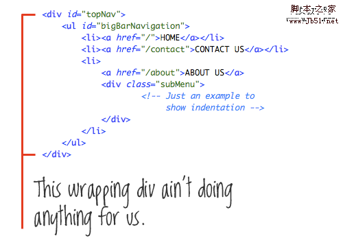 在上图的例子中,我们使用了一个 div (”topNav”) 来包含了UL列表 (”bigBarNavigation”). 但DIV和UL都是区块元素,所以没有必要使用DIV来包裹UL元素。