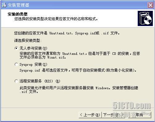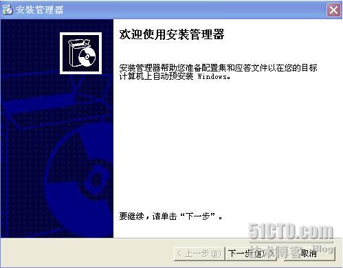 而我们做了这么多可不是为了看看它有多壮观 , 呵呵···我们是要创建一个应答文件来的。基于I的根目录下,按照这个路径打开support\tools\deploy里的setupmgr.exe。执行这个文件后出现一个安装向导: