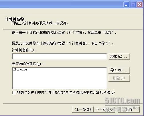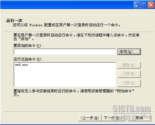 用户第一次运行时顺便运行的一个程序,可随需要,我们用cmd.exe 试试吧。输入命令——添加,下一步