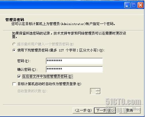 为管理员配一个密码,因为我们不希望其他一般人有服务器的口令,所以勾选下面的“在应答文件中加密管理员密码”。下一步