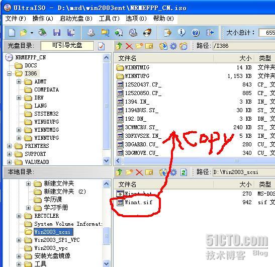 这之后,我们把win2003+sp2的内容一个不落的复制到只剩一个驱壳的win2003光盘中