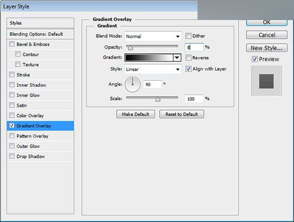 添加渐变叠加,参数设置:正常,透明度8%,线性,角度90°。