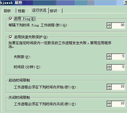 关闭时间和启动时间间隔设置:设短一些比如10秒,这样当您的网站程序大量占用系统资源时IIS自动快速回收进程并且快速启动进程,您的网站暂时还可以将就着工作。
