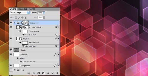 6、添加一个新层,组合这个新层,这层将在一个文件夹内。更改文件夹的混合模式为颜色减淡。使用画笔工具(B),选择我们之前创建的六边形笔刷,然后使用白色在图层上画出六边形。