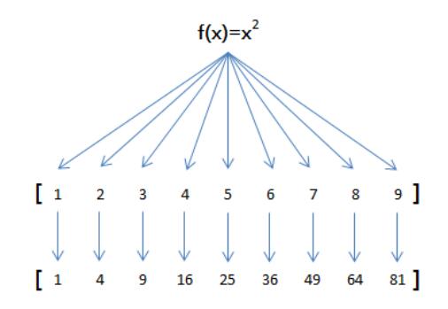 举例说明,比如我们有一个函数f(x)=x2,要把这个函数作用在一个数组[1, 2, 3, 4, 5, 6, 7, 8, 9]上,就可以用map实现如下: