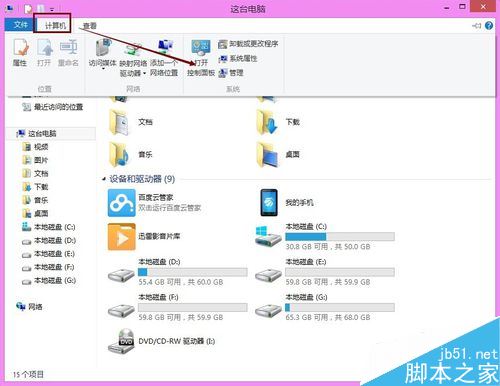 此时我们点击Win8这台电脑文件夹导航上的计算机,然后点击显示菜单里的“打开控制面板”,如下图所示。