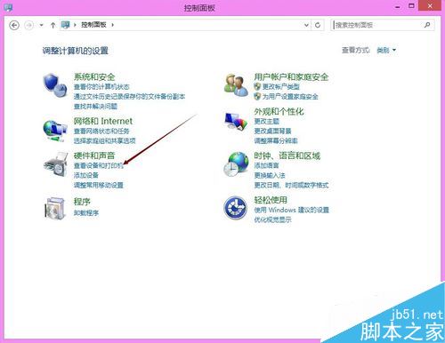 在打开的Win8系统控制面板后,我们点击硬件和声音下面的查看设置和打印机,如下图所示。