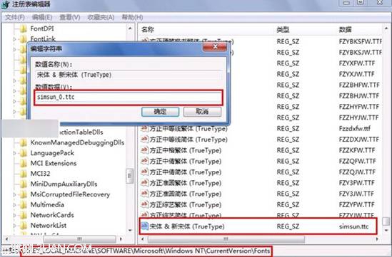 2> 运行regedit , 定位到HKEY_LOCAL_MACHINE/SOFTWARE/Microsoft/Windows NT/CurrentVersion/Fonts, 分别将"SimSun & NSimSun (TrueType)" 与 "宋体 & 新宋体 (TrueType)"数值从"simsun.ttc"修改为"simsun_0.ttc". 以下是示例, 注意红色方框标注的部分.