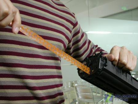 拿起硒鼓晃动摇匀后,然后开始扯橙色封装条