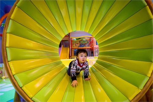 室内游乐场,为了保证蹦蹦床上孩子浮空瞬间的定格,使用35定焦,牺牲ISO以保障快门速度。