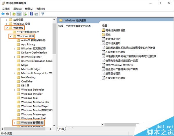 3、在组策略左侧,依次打开计算机配置 → 管理模板 → windows组件 → windows错误报告;