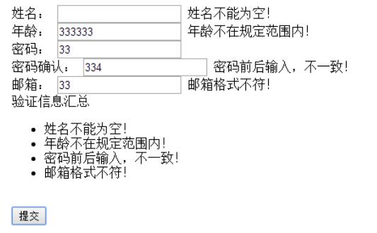 <form id="form1" runat="server"> <div> 姓名: <asp:TextBox ID="txtRequiredField" runat="server"></asp:TextBox> <%--RequiredFieldValidator:验证一个必填字段--%> <asp:RequiredFieldValidator ID="RequiredFieldValidator1" runat="server" ErrorMessage="姓名不能为空!" ControlToValidate="txtRequiredField"></asp:RequiredFieldValidator> <br /> 年龄: <asp:TextBox ID="txtRange" runat="server"></asp:TextBox> <%--RangeValidator:RangeValidator控件可以用来判断用户输入的值是否在某一特定范围内--%> <asp:RangeValidator ID="RangeValidator1" runat="server" ErrorMessage="年龄不在规定范围内!" ControlToValidate="txtRange" MaximumValue="100" MinimumValue="0" Type="Integer"></asp:RangeValidator> <br /> 密码: <asp:TextBox ID="txtPassword" runat="server"></asp:TextBox> <br /> 密码确认: <asp:TextBox ID="txtPasswordConfirm" runat="server"></asp:TextBox> <%-- CompareValidator:将用户输入与一个常数值或者另一个控件或特定数据类型的值进行比较(使用小于、等于或大于等比较运算符)--%> <asp:CompareValidator ID="CompareValidator1" runat="server" ErrorMessage="密码前后输入,不一致!" ControlToCompare="txtPassword" ControlToValidate="txtPasswordConfirm"></asp:CompareValidator> <br /> 邮箱: <asp:TextBox ID="txtMail" runat="server"></asp:TextBox> <%--RegularExpressionValidator:它根据正则表达式来验证用户输入字段的格式是否合法,如电子邮件、身份证、电话号码等--%> <asp:RegularExpressionValidator ID="RegularExpressionValidator1" runat="server" ErrorMessage="邮箱格式不符!" ControlToValidate="txtMail" ValidationExpression="\w+([-+.']\w+)*@\w+([-.]\w+)*\.\w+([-.]\w+)*"></asp:RegularExpressionValidator> <br /> <%--ValidationSummary:该控件不执行验证,但该控件将本页所有验证控件的验证错误信息汇总为一个列表并集中显示--%> <asp:ValidationSummary ID="ValidationSummary1" runat="server" HeaderText="验证信息汇总" /> <br /> <asp:Button ID="btnSubmit" runat="server" Text="提交" OnClick="btnSubmit_Click" /> </div> </form>