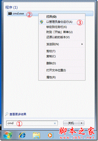 首先,根据如下图示以管理员身份运行“cmd.exe”。为此,单击 Windows 开始图标,在“搜索程序和文件”输入框中键入“cmd”,在搜索结果中用鼠标右键单击“cmd.exe”,并在弹出的列表中单击“以管理员身份运行”。