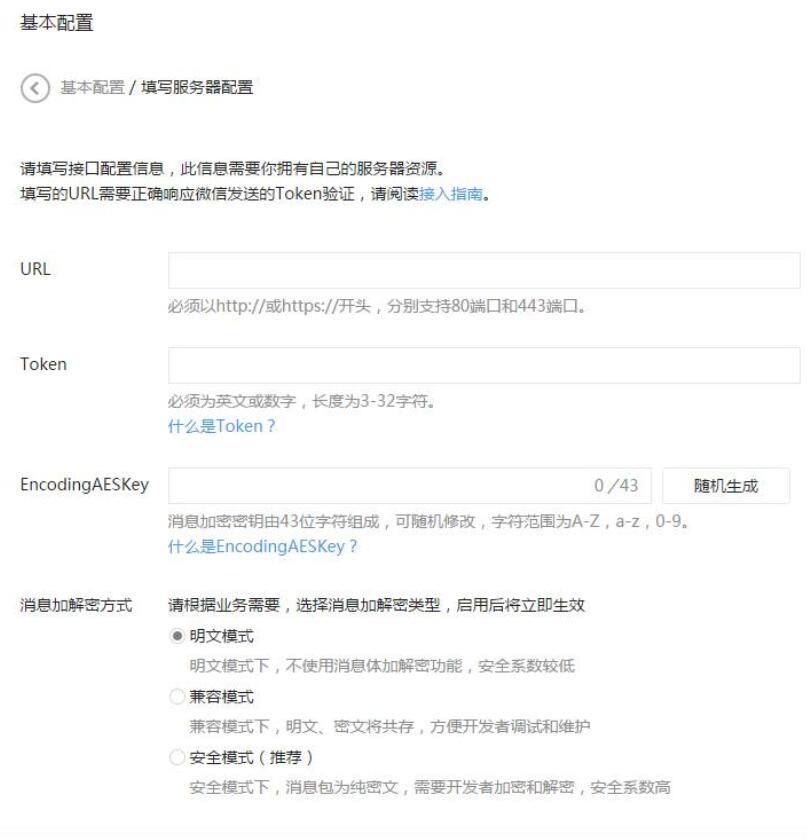 下面是基本配置的页面,在URL中填写服务器地址,这个地址就是接受微信推送事件的一个接口,我是使用thinkPHP框架开发的程序,在其中一个Module(Decoration)的Action目录下新建一个类,比如叫: WechatAction.class.php ,在该Action中新建一个public方法,比如叫: URLRedirect() ,那么在这个URL中填写的就是 http://[IP]:[port]/index.php/Decoration/Wechat/UrlRedirect ,然后填写Token,Token随意填,EncodingAESKey要不要都行,然后点击确认,微信会往这个URL上发送一个get请求,里面包含很多参数,其中大部分都是让我们自己核对这次访问是不是微信服务器请求的,我自己没有验证,他的要求是如果我们核对成功,即原样返回get请求中的一个参数echostr,这里的返回不是return,也不是ajaxReturn,而使用echo,如果用thinkPHP开发的话,直接使用 echo I('echostr'); 即可。然后接口即验证成功了。