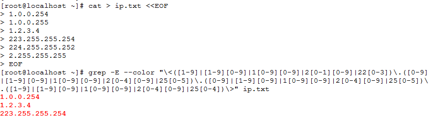 grep -E --color "\<([1-9]|[1-9][0-9]|1[0-9][0-9]|2[0-1][0-9]|22[0-3])\.([0-9]|[1-9][0-9]|1[0-9][0-9]|2[0-4][0-9]|25[0-5])\.([0-9]|[1-9][0-9]|1[0-9][0-9]|2[0-4][0-9]|25[0-5])\.([1-9]|[1-9][0-9]|1[0-9][0-9]|2[0-4][0-9]|25[0-4])\>" ip.txt