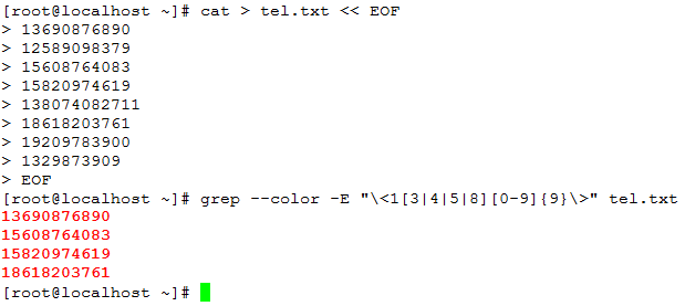 grep --color -E "\<1[3|4|5|8][0-9]{9}\>" tel.txt